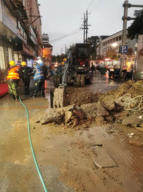 11月4日早上6时许,邵武水务公司熙春水厂监测到邵武市区供水压力异常骤降,经过多方排查迅速判断出为供水管网破裂导致的水压下降。公司第一时间组织管网稽查人员对全市主要供水管网进行巡查、探漏,经过近2个小时的努力,终于将漏点锁定在城裕大楼外的DN300主干管。